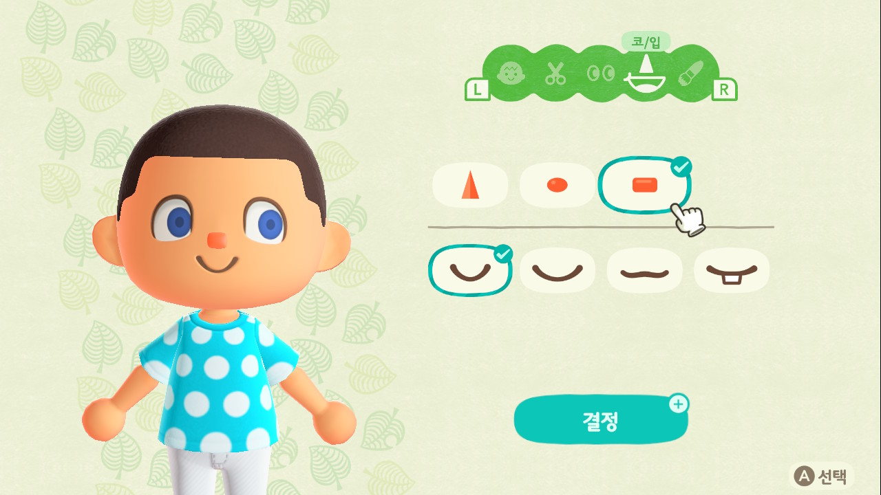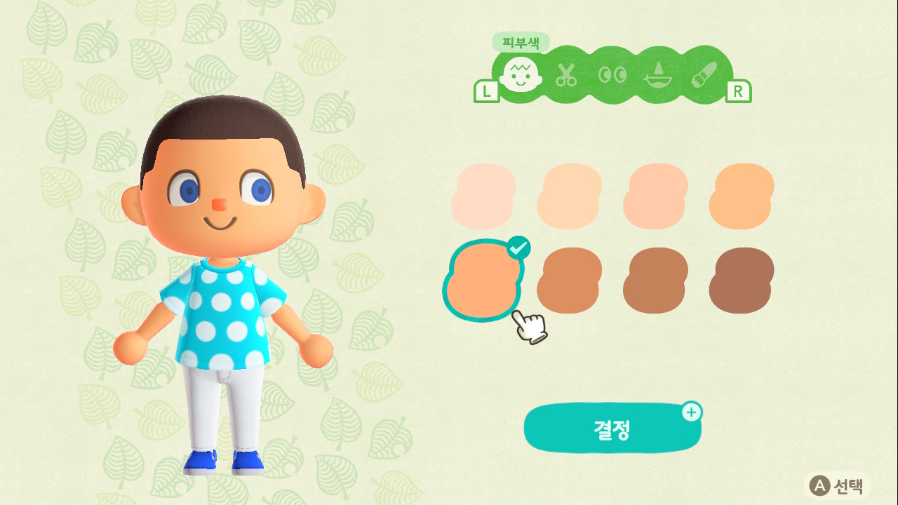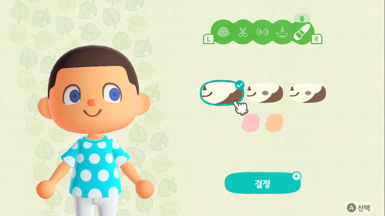 캐릭터는 피부색, 헤어스타일, 눈, 코와 입, 그리고 볼터치를 선택하여 만들수 있어요.