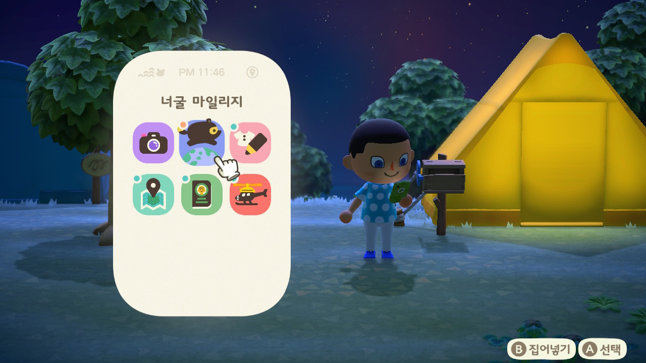 텐트에서 하루를 보내고 나오면 너굴이 텐트 앞에서 기다렸다는 듯이 말을 건냅니다.