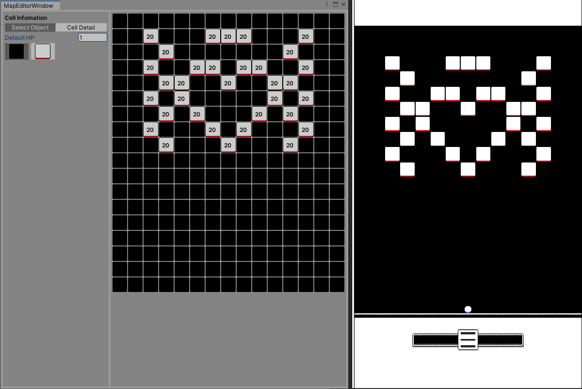 맵 에디터 (좌), 게임에 적용된 화면(우) 맵 에디터의 좌측에서 어떤 벽돌을 배치할지 선택한 후 우측의 맵의 각 셀을 클릭하면, 그 자리에 선택한 벽돌이 배치되도록 제작하였어요.